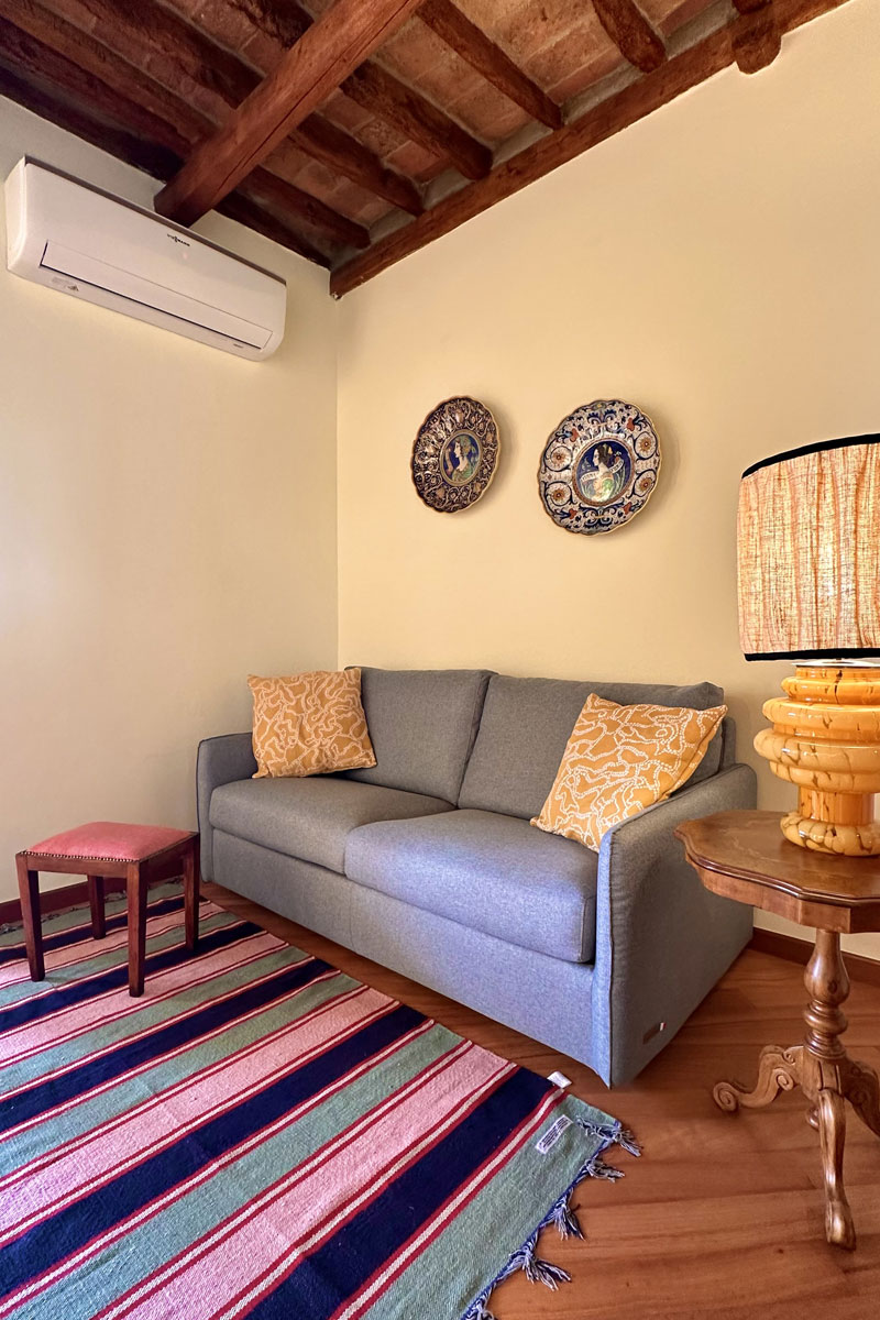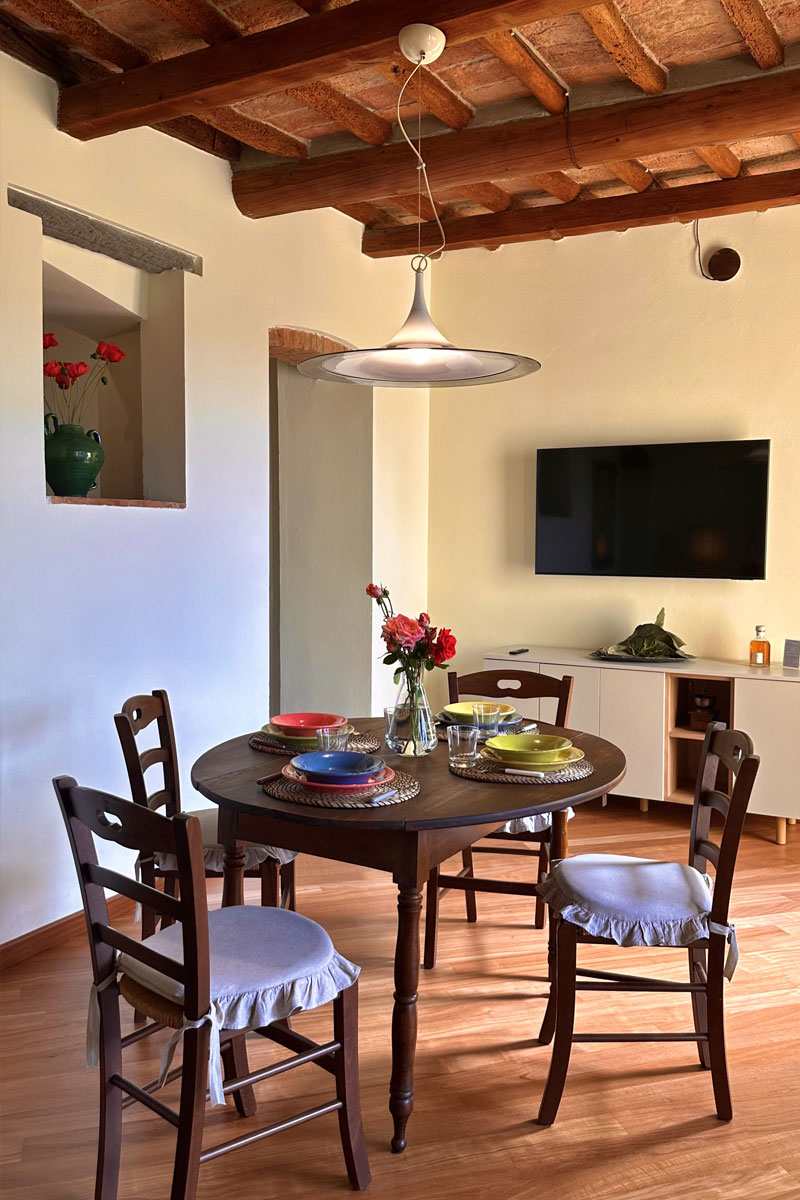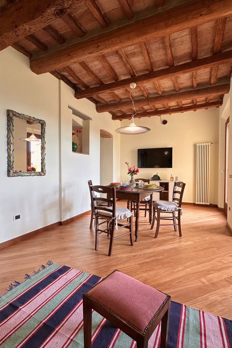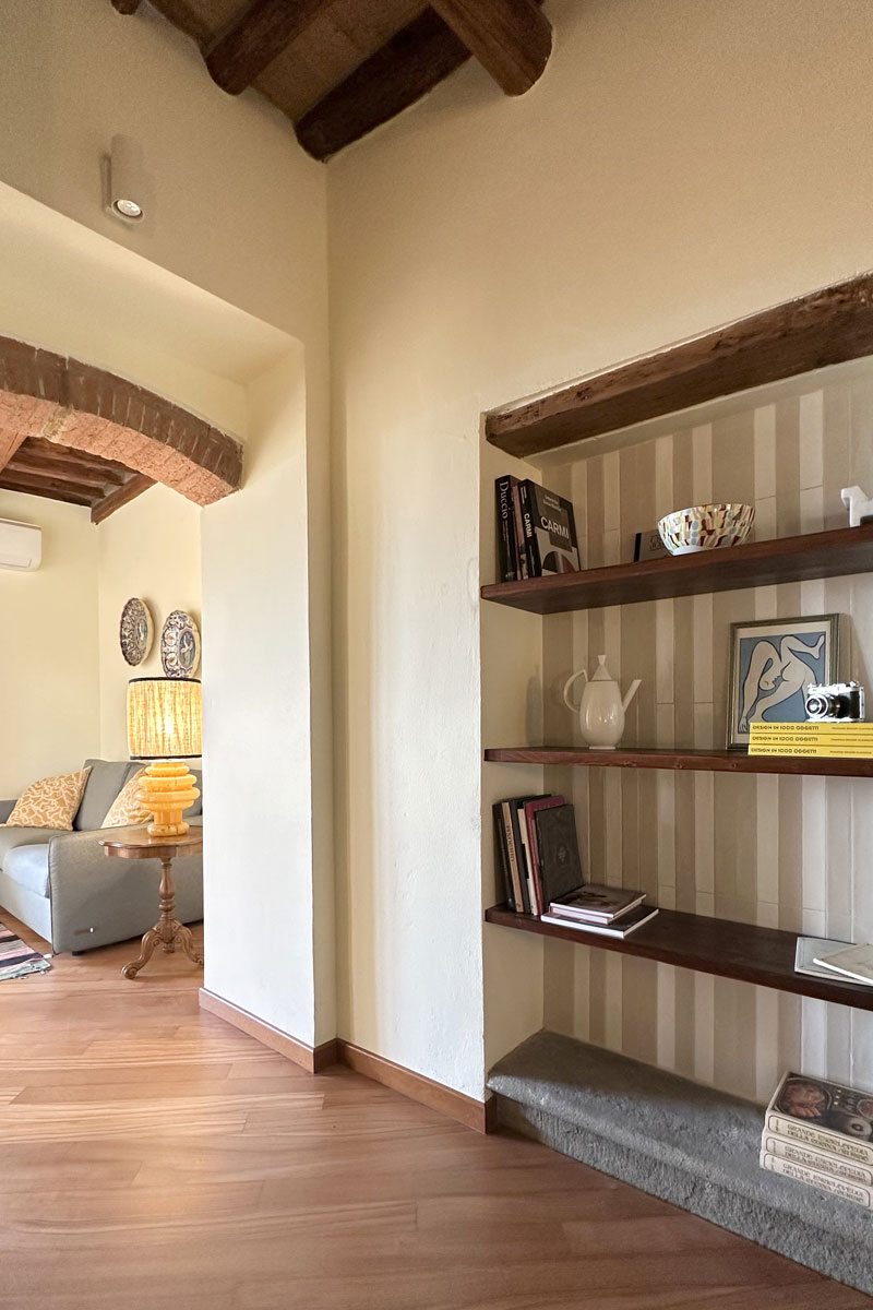 Un appartamento di 80 mq luminoso e accogliente, con interni raffinati e finiture di qualità: travi in legno a vista e pietra serena si fondono con il design contemporaneo per garantire un soggiorno confortevole e di stile.
